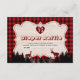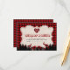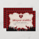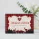 Rustikales Jagdmotiv-Design: eine gewaschene alte Scheunenform mit gepunktetem rotem Büffelrahmen, Hirsche, Tannenbäume, alles auf einem roten, schwarzen Büffel kariert als Hintergrund. Verwenden Sie das Tool Anpassen, um Ihre Informationen hinzuzufügen. Für passende Artikel besuchen Sie bitte meine Lumberjack Party Collection.