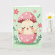 This greeting card features a newly hatched little bird nestled in the jagged top of a bright pink eggshell with white polka dots, its tiny wings lifted as if reaching toward a nearby friend. The chick is a soft cream color with closed eyes, rosy cheeks, and a small open beak, giving it a tender, content look that feels like a quiet hello. Behind it, a light pastel green background is patterned with a faint, uneven grid that adds gentle texture without distracting from the scene. Small five-petaled pink flowers and a few slender green sprigs are scattered around, like springtime notes drifting across the page 🌷. The warm pinks and soft greens sit close together, creating a cozy, affectionate mood in the way the chick seems safely held by the shell. There is no message text printed on the front, leaving open space above and around the illustration for the artwork to breathe. The eggshell’s rim curves upward with irregular cracks, and the white dots vary slightly in spacing across the pink surface 🐇.