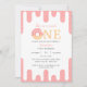 Dieses Design ist mit einem rosa Donut und einem pinkfarbenen, süßen Creme tropfenden Hintergrund ausgestattet. Feiern Sie den Geburtstag Ihres Liebsten, indem Sie diese Einladung zum Geburtstag in Rosa personalisieren. Perfekt für Mädchen zum ersten Geburtstag Einladung.