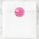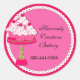 Hübsche, runde Aufkleber in einem zweifarbigen rosa Hintergrund, mit einem dekorativen, weiß geschossenen Rahmen. Die farbenfrohe Grafik eines Kuchenbestandes mit Kuchen schmückt diesen zu süßen Bäckereiaufkleber. Text in schwarz ist bereit, für Ihr Unternehmen anpassen. Ideal für Bäckereien, Zuhause-Bäcker und Kuchendekoratoren, um als Siegel für Kuchenschachteln und andere Verpackungen zu verwenden. Persönlich für Ihr Unternehmen.