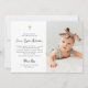 Diese schlichte und stilvolle, schwarz-weiße religiöse Taufe oder Weihnachtseinladung enthält eine skurrile, Vintage Schriftzeichen-Typografie und ein Imitat Goldkreuz mit dem Foto Ihres Babys. Ein elegantes, klassisches minimalistisches Aussehen, das immer noch einzigartig und zeitgemäß und auch geschlechtsneutral ist, für einen Jungen oder ein Mädchen.