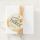 Celebrate your little one’s third birthday with this adorable “It’s So Sweet to Bee Three” round favor tag, featuring charming watercolor bees, honeycomb accents, a beehive, and a soft buttercream yellow background framed in white for a clean, modern look. The design includes customizable text below the main phrase, perfect for adding your child’s name, birthday date, or a short message.