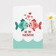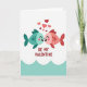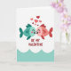 This greeting card shows two cute, stylized fish leaning in for a gentle kiss 🥰, set on a bright white background that keeps all the focus on their closeness. One fish is teal-green and the other is coral-pink, and both have wide smiles with small pink blush marks that make their affection feel easy and sweet. Tiny heart shapes decorate their bodies, adding a soft romantic touch without crowding the scene. From the spot where their mouths meet, several red hearts float upward in different sizes, like little bubbles of love ❤️. Centered beneath the fish, the words “BE MY VALENTINE” appear in strong red, standing out clearly against the white space. Along the bottom edge, a simple wavy teal line suggests water and gives the design a calm base. The red hearts rise above the couple while the teal wave gently curves across the lower part of the card.