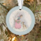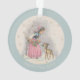 Dieses Ornament zeigt eine süße Weihnachtsszene eines kleinen Mädchens in rosa Vintage Kostümherrschaft Ansammlung heilige Zierschriften mithilfe einer niedlichen Fawn. Passen Sie es mit dem Jahr oder Text Ihrer Wahl in beigen dekorativen Buchstaben an der blauen Grenze an.