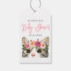 Niedliche Babyduschenschilder mit einem skurrilen rosa Drehbuch und einer bemalten Aquarellkatze mit rosa und lila Blume am unteren Ende des Designs. Die Babydusche-Geschenketiketten mit dem Namen und dem Datum der Babydusche der Mutter, die sie tragen soll, sind individuell gestaltet. Auf der Rückseite des Geschenktafels befindet sich ein rosa-weiß gepunktetes Design.