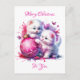 Hübsche Weihnachtspostkarte mit rosa Thema. Zwei kleine, weiße, flauschige Kätzchen spielen mit einem rosa funkelnd Weihnachtsschmuck. Alle Texte auf dieser Urlaubskarte können personalisiert sein.