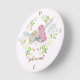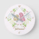 Sweet Wreath Bunny Round Clock featuring two floppy ear bunnies in a delicate bud wreath on soft pink background. Add your little one's name in personalize area. A great shower, first birthday gift, or addition to a little girl's room.