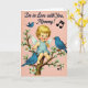 This card features a vintage-style illustration of a winged baby with golden curls, bright blue eyes, and rosy cheeks, seated on a twisting branch dotted with white blossoms and green leaves. The baby wears a pale blue one-piece outfit and smiles as if sharing a secret with someone close, adding a gentle, affectionate tone ❤️. Three small blue birds gather nearby—two perched on the branch and one gliding above—leaning in as though they’re joining the baby’s message like close friends. The background is a soft dusty-rose color that keeps the scene calm and tender. Near the upper area, the text reads “I’m in Love with You, Mommy!” in a flowing dark ink that stands out clearly against the pink. A couple of tiny musical notes sit beside the words, suggesting a sweet little tune 🌼. The branch curves across the lower half of the design, with clusters of white petals and leaves framing the baby and birds.