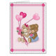 Zwei bezaubernde Teddy-Bären. Der kleine Bär hat einen Strauß von Ballonherzen und Rose, und der kleine Bär sieht sie bewundernswert an. Sie sind in einem rosa Rahmen mit kleinen Herzakzenten gerahmt.