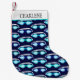 Swimmers will love this Christmas stocking patterned with swimming goggles in shades of blue on a navy blue background