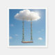 A whimsical swing adorned with colorful flowers and ivy hanging from a fluffy cloud against a vibrant blue sky, creating a scene of surreal charm.