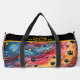 This colorful pattern duffle bag features a mesmerizing swirling cosmic design in vibrant hues, liberally accented with classic black paw prints and twinkling stars. It's a unique and stylish pet accessory, perfect as a travel storage carrier for any pet lover.