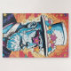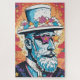 Dieses Rätsel zeigt eine farbenfrohe Vektorgrafik eines männlichen ikonischen Trendsetters mit modischem Outfit, weißem Haar und Bart, sternförmigen Sonnenbrillen und Blume dekorierten Hut. Das ist ein großes und herausforderndes Rätsel für Fashion-Rätsel.