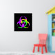 Schwarzes Poster mit einem lebendigen grünen und lila Biogefährdung-Symbol.