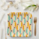 Symmetrical retro pattern with interlocking teal, yellow, and orange shapes on a beige background. Black star-like accents add contrast, creating a vintage feel.