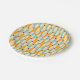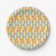 Symmetrical retro pattern with interlocking teal, yellow, and orange shapes on a beige background. Black star-like accents add contrast, creating a vintage feel.
