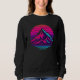 Stay warm in style with this bold sweatshirt featuring a synthwave-inspired mountain design in neon shades of pink, purple, and blue. Set against a circular retro sunset with gradient stripes, this graphic blends 1980s nostalgia with modern streetwear flair. Perfect for fans of vaporwave, retro art, and anyone who loves eye-catching fashion with a touch of nature and digital aesthetics.