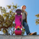 Mit diesem Vaporwave-Skateboard, mit einer elektrischen Orange für den Sonnenuntergang, Set gegen einen dunkelsternigen Himmel, fahren Sie in den Straßen im Retro-futuristischen Stil. Silhouetten Palmen stehen hoch, während ein leuchtendes Retrogitter in die Ferne reicht und das Wesen der 80er-Synthwave-Nostalgie einnimmt. Feine Glittereffekte, Scan-Linien und ein traumhaftes Glühen lassen dieses Design zum Leben erwecken und sind somit perfekt für Skater, die fette Ästhetik und futuristische Lieben haben. Egal, ob Sie den Bürgersteig zerkleinern oder als Kunst darstellen, dieses auffällige Skateboard ist ein Muss für jeden Vaporwave-Liebhaber.