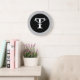 Moderne personalisierte Wanduhr mit Monogramm-Initial. Der Buchstabe T wird auf einer silbernen und schwarzen Rundwand angezeigt. Initial ist vollständig anpassbar. Die Farbe des Silber-Hintergrunds kann an Ihre Gestaltung angepasst werden. Design von WebzPickz.