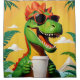 Cooler T-Rex Dinosaurier mit Sonnenbrille und einer entspannenden Tasse Kaffee in einem tropischen Ambiente