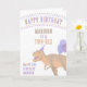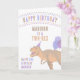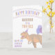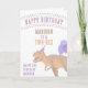 Diese farbenfrohe Dinosaurier Happy Birthday Card ist bereit, für Ihr Kind, Ihr Enkel oder Nichten und Neffen personalisiert zu sein. Auf der Vorderseite folgt der glückliche Geburtstag in einem farbenfrohen Bogen mit bunten Buchstaben, um den Namen des Kindes in Braun und seinem Dinosaurier-Alter (ONASAURUS, TWO-REX, DREI-REX, DINO VIUR, FÜNF ASAURUS usw.) in pachy tan hinzuzufügen. Das Hauptelement ist der T-Rex in einem Party, der mit Ballons ausgestattet ist und zu den links von ihm farbenfrohe Buchstaben sind HAPPY BIRTHDAY - fügen Sie das Geburtstagsjahr des Kindes (1., 2., 3. usw.) in blau und darunter, ihr Name wieder in lila. Im Inneren ist Platz für Ihre personalisierte Happy Birthday Nachricht. Diese Dinosaurier-Geburtstagskarte ist niedlich für Jungen und Mädchen mit einem braunen, bräunlichen, pfirsichfarbenen, blauen und lila Farbthema, das geschlechtsneutral gestaltet ist.