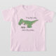 Ein T-Shirt mit einem lustigen T-Rex Cartoon: T-Rex bei Gänseblümchen pflücken. Text: "T-Rex tiny arms hates daisy picking"