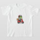 A fun and vibrant cartoon design featuring an adorable green frog working as a courier. The cheerful character wears a red retro helmet with goggles and a white uniform shirt while riding a classic red motor scooter. A cardboard delivery package is securely strapped to the rear rack, capturing a scene of speedy and happy service.