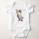 Dieses Bild zeigt ein weißes Baby-Kleidungsstück, das mit einer Cartoon-Ente bedruckt ist, die eine lila Baseballkappe trägt und eine Holzfledermaus hält, die eine selbstbewusste Pose bildet. Der Text "Dein Text" über der Ente weist darauf hin, dass es sich um ein anpassbares Design handelt. Der spielerische, sportliche Charakter macht es zu einer lustigen und einzigartigen Wahl für thematische Babywäsche oder personalisierte Geschenke.
