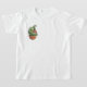 This heartwarming illustration depicts a delightful scene of friendship nestled inside a classic brown terracotta plant pot. A large, fluffy green moss monster with wide, sparkling eyes and a happy smile wraps its arms affectionately around a tiny, adorable red-and-white spotted mushroom. Surrounded by decorative fern fronds, the two garden characters share a cozy embrace, featuring blushing cheeks and cheerful expressions that radiate positivity and nature-inspired charm in a clean cartoon style.