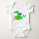 Dieses Foto zeigt ein weißes Babyoutfit mit einem spielerischen grünen Drachen mit lila Flügeln und einem feinen Ausdruck. Das farbenfrohe Cartoon-Design verleiht Kinderbekleidung eine lustige und skurrile Touch.