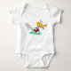 Dieses Foto zeigt ein weißes Babyoutfit mit einer albernen gelben Ente, die als Seemann gekleidet ist, mit einem Holzpaddel und einem feinen Gesicht. Das fröhliche Cartoon-Design verleiht Kinderbekleidung Spaß und Verspieltheit.