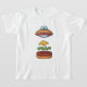 A playful, cartoon-style illustration showing a colorful UFO hovering above a perfectly stacked burger scene. A tiny green alien peers through a glass dome, while the burger layers float apart below—cheese, wavy greens, and a textured patty suspended in mid-air. Bold outlines, vibrant colors, and smooth shading create a fun sci‑fi vibe blended with whimsical food art, giving the image a lighthearted, imaginative, and eye-catching character.