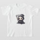A soft, kawaii-style grim reaper sits quietly against a deep black background, wrapped in a flowing dark hooded cloak. The oversized round eyes, blushing cheeks, and tiny worried expression give the character an unexpectedly sweet and innocent mood. Cradled in its arms is a calm black cat, eyes closed in peaceful comfort, while a curved silver scythe rests gently at the side. Smooth shading, muted tones, and rounded shapes transform a traditionally dark figure into a tender, heartwarming illustration with a touch of quiet charm.