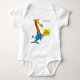 Dieses Bild zeigt ein weißes Baby-Kleidungsstück, das mit einem in einem blauen Anzug gekleideten Cartoon-Giraffe bedruckt ist und ein gelbes Schild mit der Aufschrift "Deine Nachricht hier!" fröhlich hochhält. Der Text "deines Textes" über der Giraffe legt nahe, dass es sich um ein anpassbares Design handelt. Die skurrile, berufliche Giraffe macht sie zu einer reizvollen und lustigen Wahl für personalisierte Babywäsche oder Neuigkeiten.