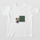 This charming vector illustration features an intelligent-looking brown and white dog character assuming the role of a teacher. The puppy is dressed professionally in a navy blue suit jacket, a crisp white shirt, and a bright red tie, topped off with round spectacles for a scholarly appearance. Standing with a wagging tail, the canine educator holds a thin wooden pointer, directing attention to a large, empty green chalkboard framed in wood with a piece of chalk resting on the tray.