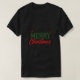 Das T - Shirt-Design zeigt den Text "Frohe Weihnachten" in fröhlichen, hellen Farben, auf einem weißen T - Shirt mit einem Vintagen, verblassten Effekt gedruckt. Das Design ist festlich und feierlich, perfekt für die Weihnachtszeit.
