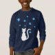 Eine weiße Schneekatze mit einem eisblauen Stern, der von ihrem Schwanz hängt. Ein Sternenhimmel von passenden Sternen ist vorne und hinten.