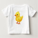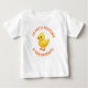 Weißes Jersey-T-Shirt für Kleinkinder mit Blick auf die Zeichnung eines gelben Küchens mit dem Wort "DAS KLEINE KÜKEN AN SEINE ELTERN" und auf dem Rücken ein gelbes Küken allein