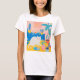 eine Illustration mit einer lustigen weißen Katze, die auf einem Tisch in einem hellgelben und rosa Raum sitzt. Ein T - Shirt mit einem fröhlichen Druck für eine Frau in hellen Tönen.