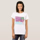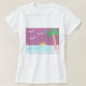 Dieser weiße T - Shirt ist mit einer untergehenden Sonne, blauen Ozeanen, Palmen und einem magentafarbenen Himmel gestaltet.