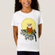Die Eule sitzt auf dem Ast vor Vollmond. zeichnend Cartoon. Der Vogel ist braun mit weißem Gesicht und gelben Füßen, gelber Mond mit goldenen Kanten und Ast ist schwarze Silhouette.