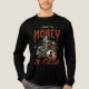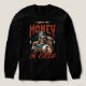 The centerpiece of the design features a formidable skeleton gangster wearing a classic fedora and a dapper suit jacket. The skeletal figure is captured in a high-stakes moment, clutching a large bag of money marked with a bold dollar sign in one hand while wielding a detailed handgun in the other.