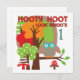 Owl First Birthday T - Shirt, Karosseriebücher, Tasse, Magnete, Halsbecher, Plakate, Taschen und mehr mit einer Eule, vielen Bäumen, und Text, der lautet "Hooty Hoot Look Whoo's 1"!