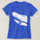 Modedesignvoller zweifarbiger T - Shirt mit einem stilisierten, prägnanten, kreativen, konzeptuellen, minimalistisch-modernisierten Meerjungfrau-Gesicht und einem blau-weiß-geprägten "Mermaid"-Buchstaben.