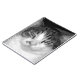 Graustufen-Foto einer Katze in Tabby und Weiß, geschnitten, um die Nähe des Gesichts zu zeigen.