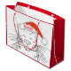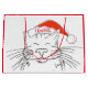 Personalisierte Katzenweihnachtsbeutel in Rot und Weiß. Der Geschenksack zeigt eine weiße und schwarze Tischkatze mit einem roten Weihnachtshut. Der Hut enthält Platz für einen Namen. Der perfekte Geschenksack für einen Katzenliebhaber oder für ein Haustier.