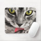 Dieses Design zeichnet sich durch ein hochauflösendes Bild einer Katze aus, mit grauem und schwarzem Fell und schönen grünen Augen. Sie leckt zuversichtlich ihre eigene Pfote, um sich selbst zu pflegen.