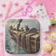 Eine Katze mit einem Tisch, bequem am Bug eines Holzschiffes mit hängenden, gekochten Seilen