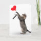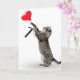 Graue Tabbykatze mit rotem Herzballon zum 7. Geburtstag auf weißem Hintergrund. Hintergrundfarbe kann geändert werden