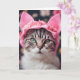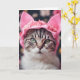 Niedliche Tischkatze mit rosa Ohrhut zum humorvollen Geburtstag. Text kann geändert werden.